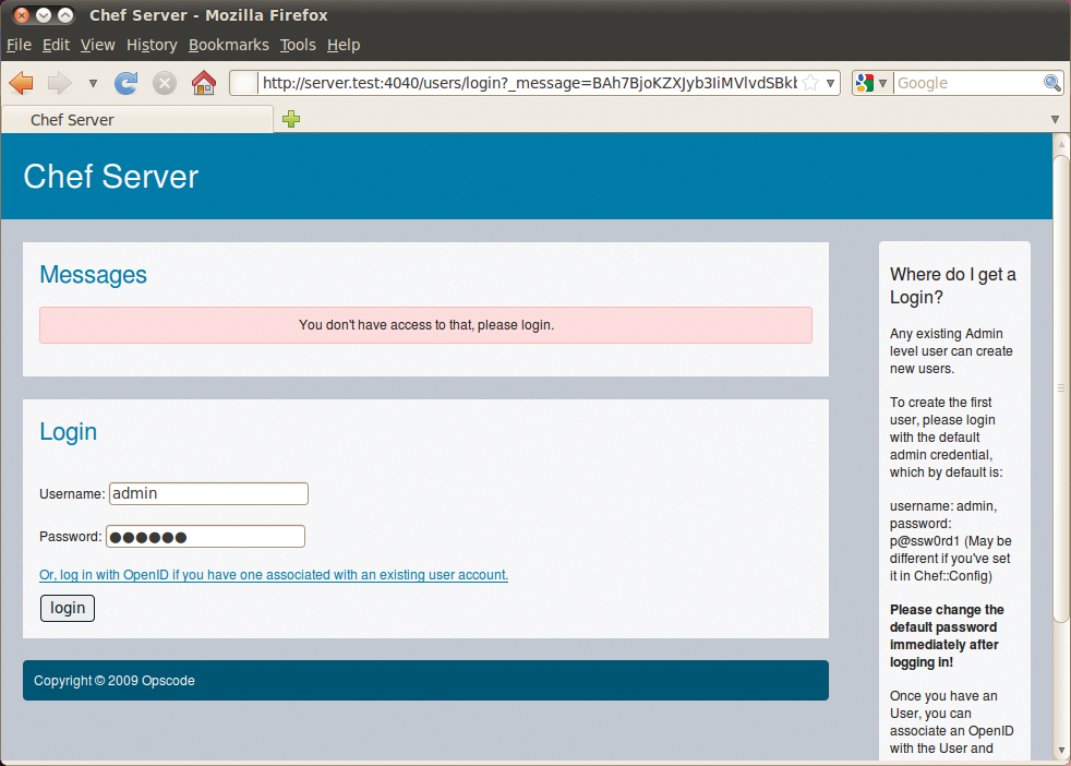 In the form that then appears, log in by typing the admin username Figure 2. The matching password is stored in the web_ui_admin_default_password line of the /etc/chef/server.rb file. Changing the slightly cryptic default after logging in the first time is a good idea.