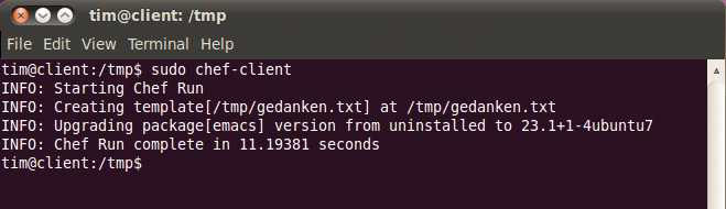 The tool creates a couple of directories, corrects the configuration files, and adds chef-client to the init scripts. The latter ensures that the client will talk to the server on booting and execute any recipe changes that have occurred in the meantime.
