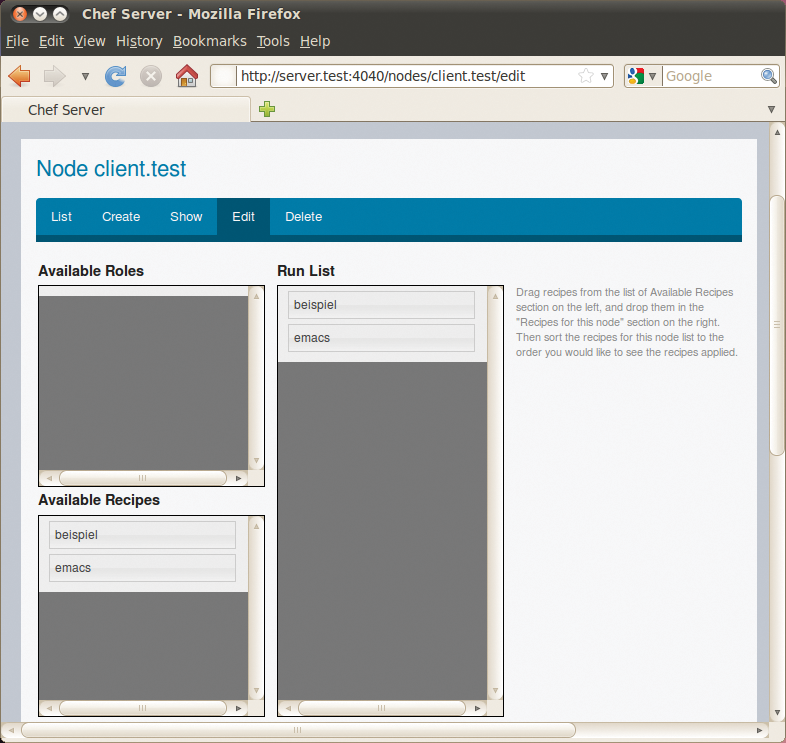 Now go to the Nodes menu. When you get there, click the client name, change to the Edit tab, and finally drag the recipe you want to use from Available Recipes and drop it into the Run List (the recipe will slot into the top position in the list). In the example, you would now see emacs at the top Figure 3. To store this assignment, press the Save Node button bottom left on the page.