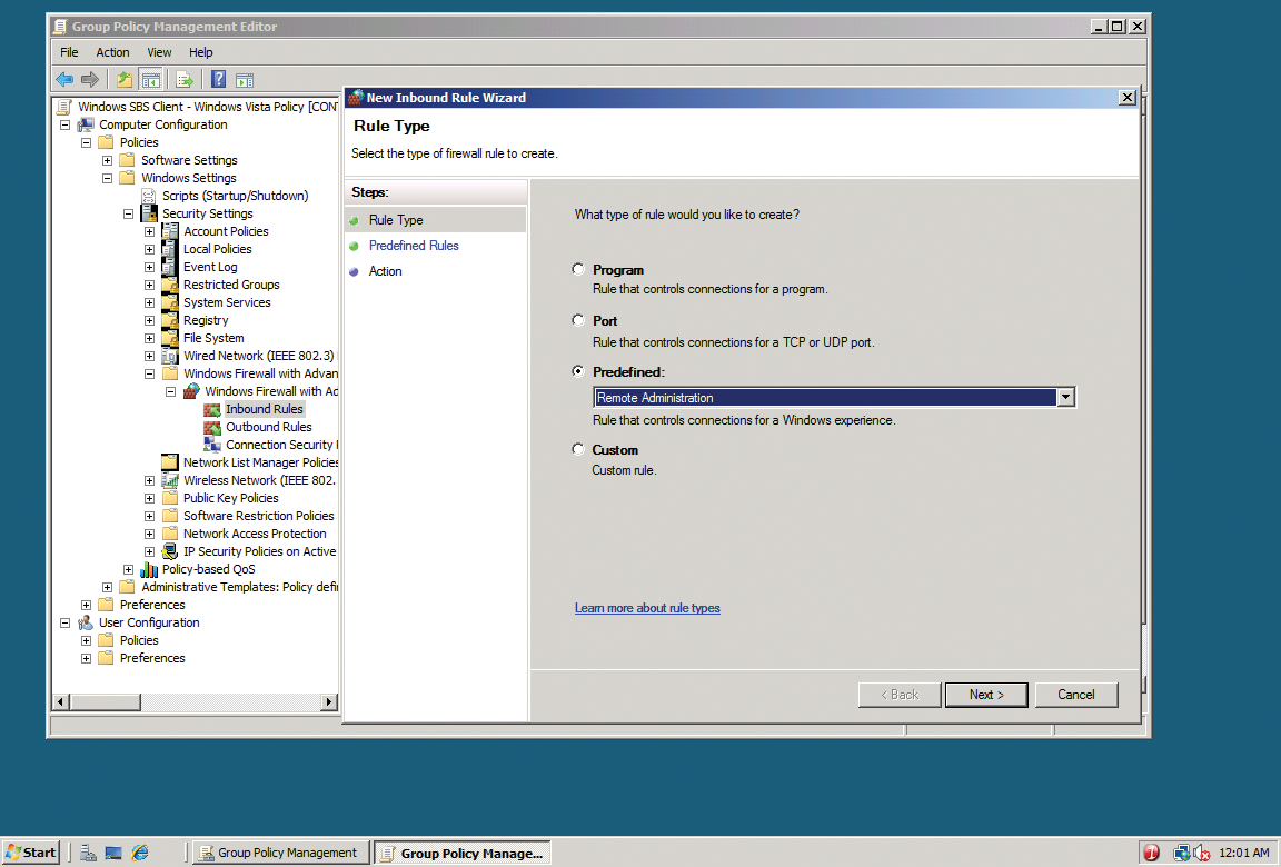 To begin, open the policy manager and navigate to Computer Configuration | Policies | Windows settings | Security Settings | Windows Firewall with Advanced Security | Inbound Rules. Next, create a new firewall rule using the Predefined | Remote Management option. Leave the other settings as they are and make sure that the Allow Connections action is enabled. To enable the rule on the clients, enter gpupdate /force or reboot.