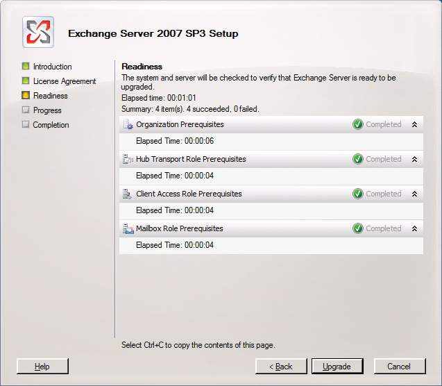 To launch the installation program for Service Pack 3 for Exchange Server 2007, double-click and choose the directory in which you will be unpacking the installation files. In the directory with the installation files, right-click on setup.exe and run the file as administrator. Now select Install Microsoft Exchange Service Pack 3. If you do not have administrative privileges, the installation will output an error message and quit. Confirm the dialogs until the wizard checks to see whether it can perform the update. If the wizard discovers an error preventing the update, you need to fix the error and relaunch the wizard. Once the check completes successfully, you can start updating by clicking on Upgrade.