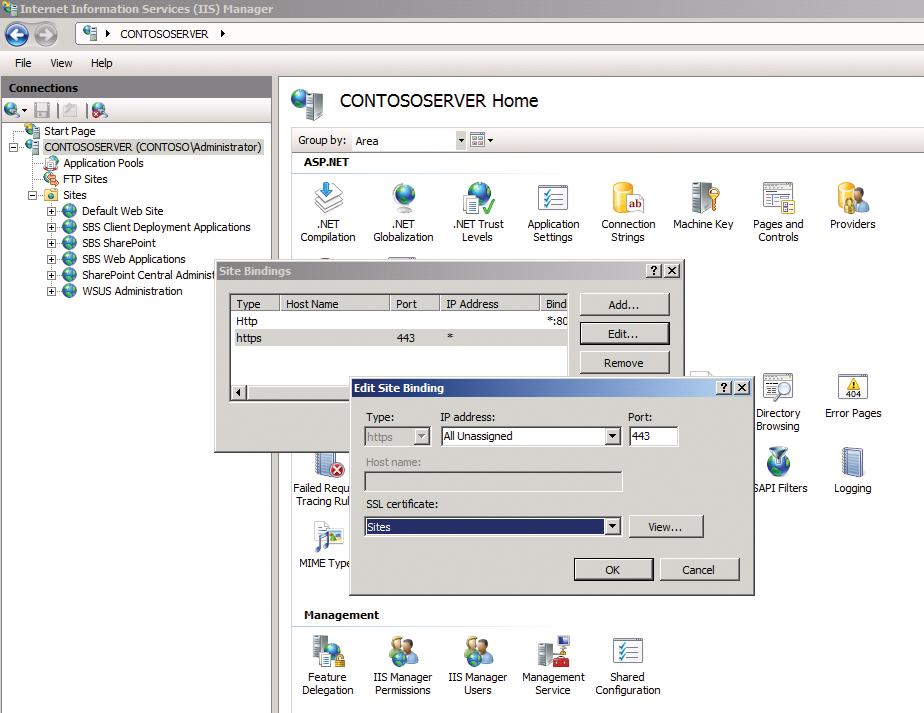 in your browser. If the page fails to open properly, you will need to change some settings in the Internet Information Service management console (Figure 5) by unfolding the Servername\Sites menu and right-clicking on SBS Web Applications. Then, in the drop-down menu, select Edit bindings and click on https then edit. For SSL Certificate, select the correct certificate for the website. In most cases, the correct choice will be Sites.