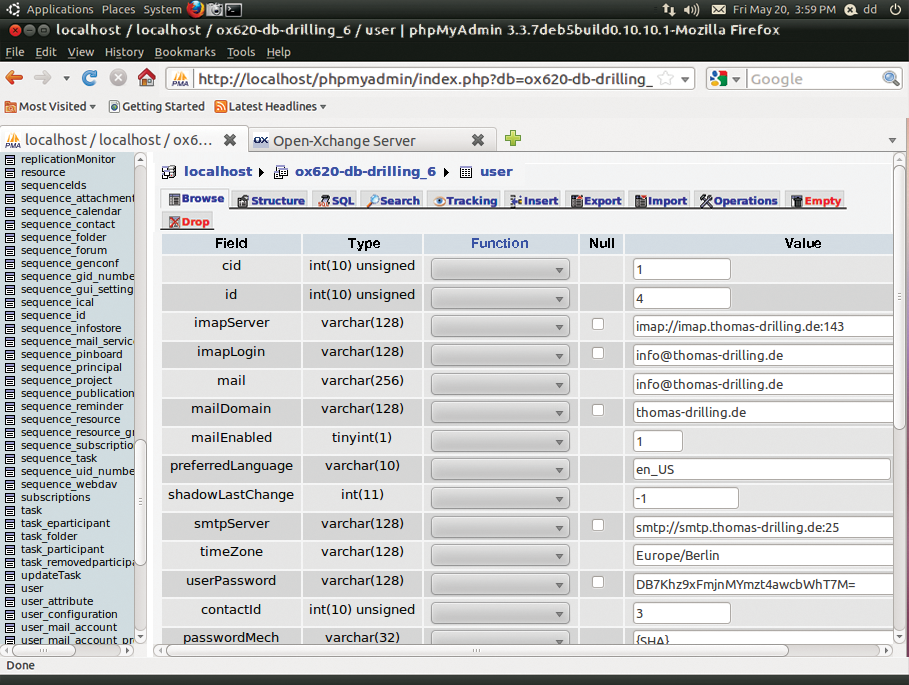 Figure 5: You can use phpMyAdmin to check the server registration. The OX server name and the server_id are listed in the server table.