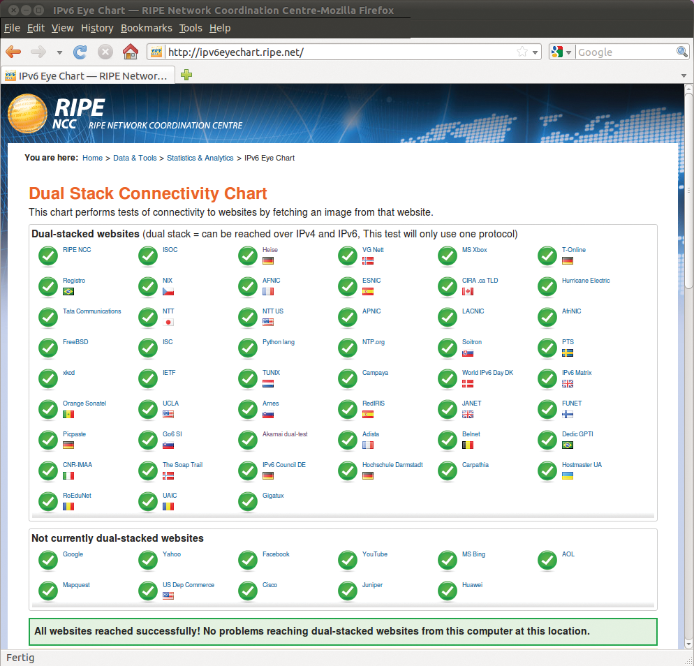 The European IP coordination center, RIPE [2], offers a test page where you can test your dual-stack connectivity (Figure 3). The test shows you clearly, and in real time, whether you can access a number of dual-stack test servers. If all of this works, you can start to concentrate on the applications themselves.