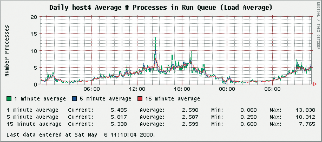 Figure 2: A 24-hour log of monitored load-averaged data (e.g., from procinfo) displayed as a time series with Orca Tools for Linux [1].