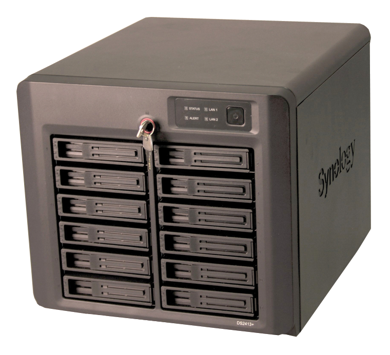 The DiskStation 2413+ is a brand-new, top-end model with 12 disk slots. This means it can accommodate up to 48TB storage, and you can even double the storage, adding the Synology DX1211 extension unit. The large capacity predestines the NAS server for use in small businesses or larger departments.