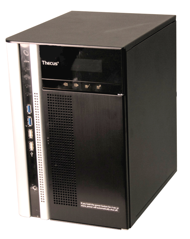 The attractive housing, with its bright OLED display and touch buttons, has immediate appeal. A vertical LED array even gives you a light show while the device is booting, indicating errors if applicable. However, the Thecus's fan noise is hard to ignore. This noise level might be due to the increased cooling requirements of the Pentium G620 CPU.