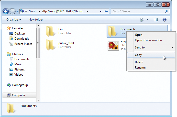 If you trust the fingerprint displayed, you can press I trust this key, enter your password and, depending on the chosen path, start work directly in the filesystem of the remote host as a normal network drive, that is, use drag and drop to copy data, or use Copy and Send to in the context menu (Figure 10).
