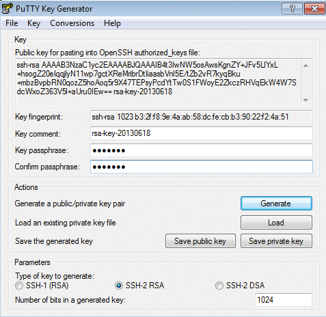 PuTTY uses the puttygen.exe (PuTTY Key Generator) tool (instead of ssh-keygen) to generate RSA (default) or DSA key pairs (Figure 4). Although you will find this tool on the PuTTY download page, make sure you have previously downloaded the full install zip file; puttygen should also be available below Putty in the Windows Start menu.