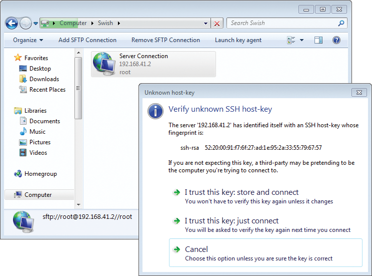 Additionally, with Swish, you may need to confirm the RSA key for the unknown host the first time you connect to it (Figure 9).