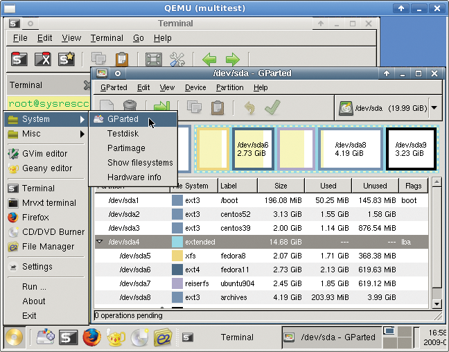 SystemRescueCd comes with a gallery of helpful system tools for diagnosing and repairing Linux and Windows computers. SystemRescueCd is based on the long-term-support Linux kernel 3.10. Boot from a CD/DVD, a USB stick, or a hard drive.