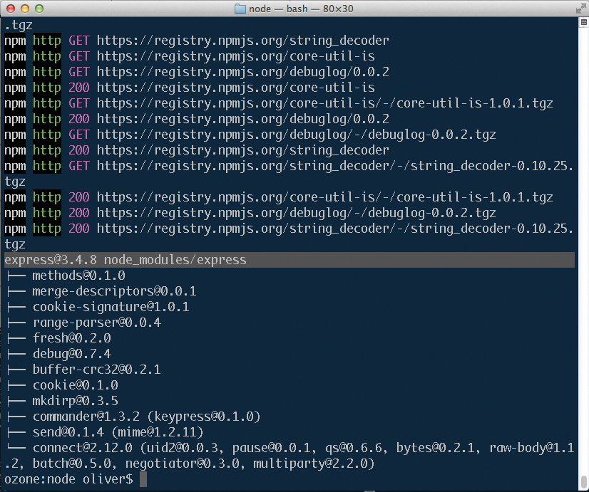 After installing the Express module by typing npm install express (Figure 1), you integrate in the normal way using var express = require('express'). Listing 2 shows how to structure your web application with Express. An Express application is generated by calling the express() function, which acts as a switching point from then on. Routing takes place in line 11. A link between the URL and the calling function is created by calling the Express method with the same name as the required HTTP method.
