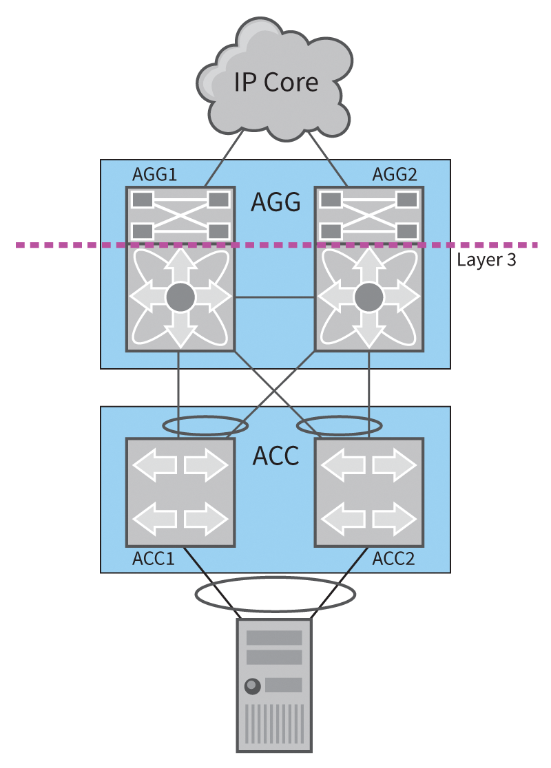 On older Ethernet networks, a topology as shown in Figure 6 is conceivable. In Figure 6, the spanning tree has disabled half the links in the Layer 2 area, and the server (bottom) uses only one of two connections. The role of the root bridge is handled by the AGG1 switch. In conjunction with AGG2, the switch forms the boundary between Layer 2 and Layer 3; the two are referred to as Layer 3 switches, although – according to the OSI Reference Model  – a switch resides in Layer 2. The two Layer 3 switches run a First Hop Redundancy Protocol (FHRP), either with the open VRRP standard or using an alternative such as Cisco's proprietary HSRP counterpart. The protocol is only active on AGG2. The First Hop is the IP default gateway of the server.