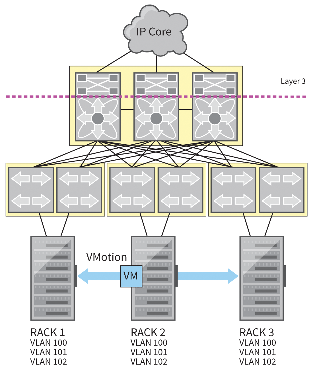 The topology shown in Figure 7 scales well, but some new challenges arise in large networks because of the possibilities of virtualization. Figure  8 shows a sample topology. Rack  1 and Rack 2 use the same VLAN, which enables the migration of a virtual machine from Rack 1 to Rack 2 on the fly using a tool such as vMotion by VMware. However, often there is only one VLAN available per rack to keep the broadcast domain small, despite a large number of virtual machines – as is the case with Racks 3 and 4.