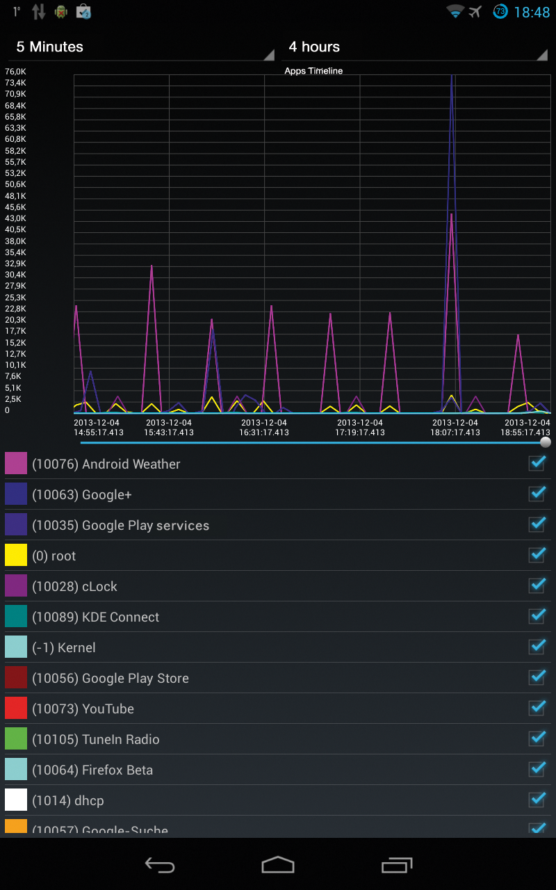 A Flashlight app, for example, that transmits data on a regular basis would at least cause an attentive user some thought. Malware or break-in tools that want to transfer large amounts of data unnoticed would have to be prepared for this or change the TCP stack to remain undetected. Again, you can monitor individual applications, set filters, and much more. Surprisingly, excessive battery consumption is not an issue during logging.