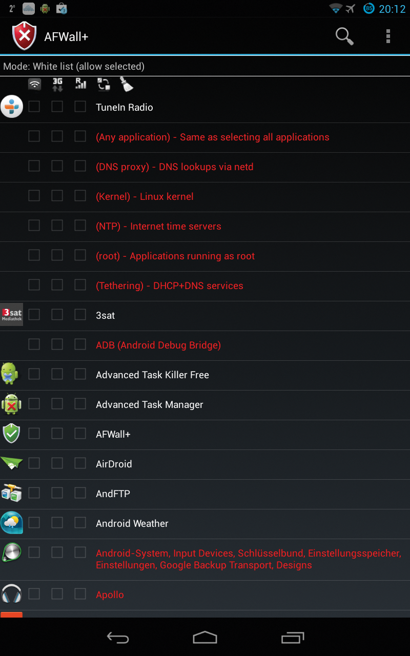 Such useful tools are a dime a dozen in the Google Play store or alternative app stores. Apparently, many websites offer top 10, top 20, or even top 30 lists of the best root apps. We gained a positive impression of tools such as Android Tuner, Cron Tasker, Adblock Plus, zAnti, or the WiFi inspection tool and PCAP sniffer WiFinspect. The AFWall [8] firewall application (Figure 2), which allows application-specific Internet access, seems similarly successful. It gives smartphone owners an easy option for preventing individual apps connecting on GSM networks and explicitly restricting access to WiFi.