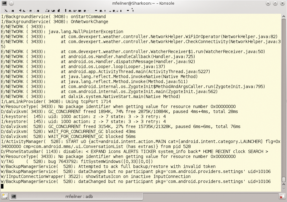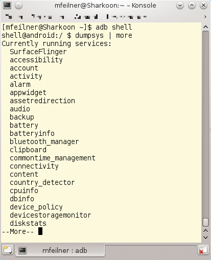More useful information about the system is provided by commands such as adb logcat (Figure 3), which displays the Android's FIFO buffer – a very interesting source of information of which hackers have occasionally also made use [2]. The dumpsys and bugreport tools in the ADB shell are similarly helpful. An interactive call to adb bugreport >/tmp/bugreport outputs a complete dump of the running system's configuration. Figure 4 uses a dumpsys example with more to show how it can be used with classic Unix tools to improve readability with the use of a pipe or output redirection to a file.