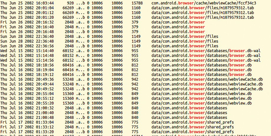 In this example, the admin wants to find and reconstruct the browser history of the Android browser. The requested file is browser.db with inode 656. This search result was missing in Listing 4 because the search was not performed recursively. However, it is interesting to see that older versions (journals) of the file also exist here.