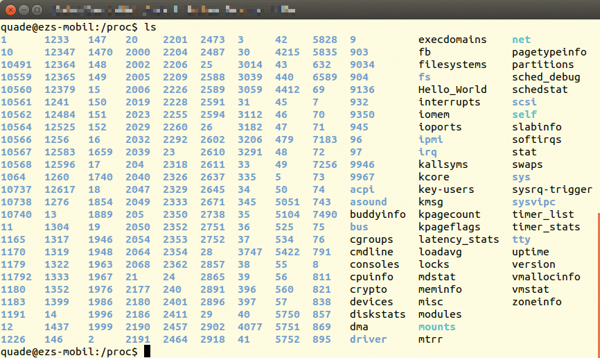 The /proc filesystem is also useful for your first steps in kernel programming: With fewer than 50 lines of code, you can make the compiler generate a module that outputs the famous "Hello World" string when accessing a proc file (Listing 1).