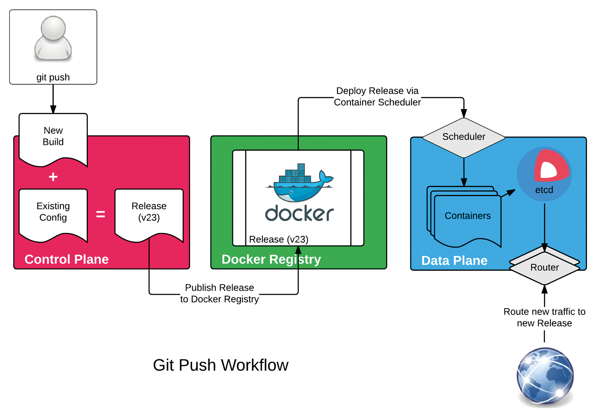 The Deis workflow occurs in three phases. In the first phase, Deis generates the container. Relying on Git, Deis receives information about container properties via finished instruction packages – called applications. The applications contain the code that is later supposed to run within a container.