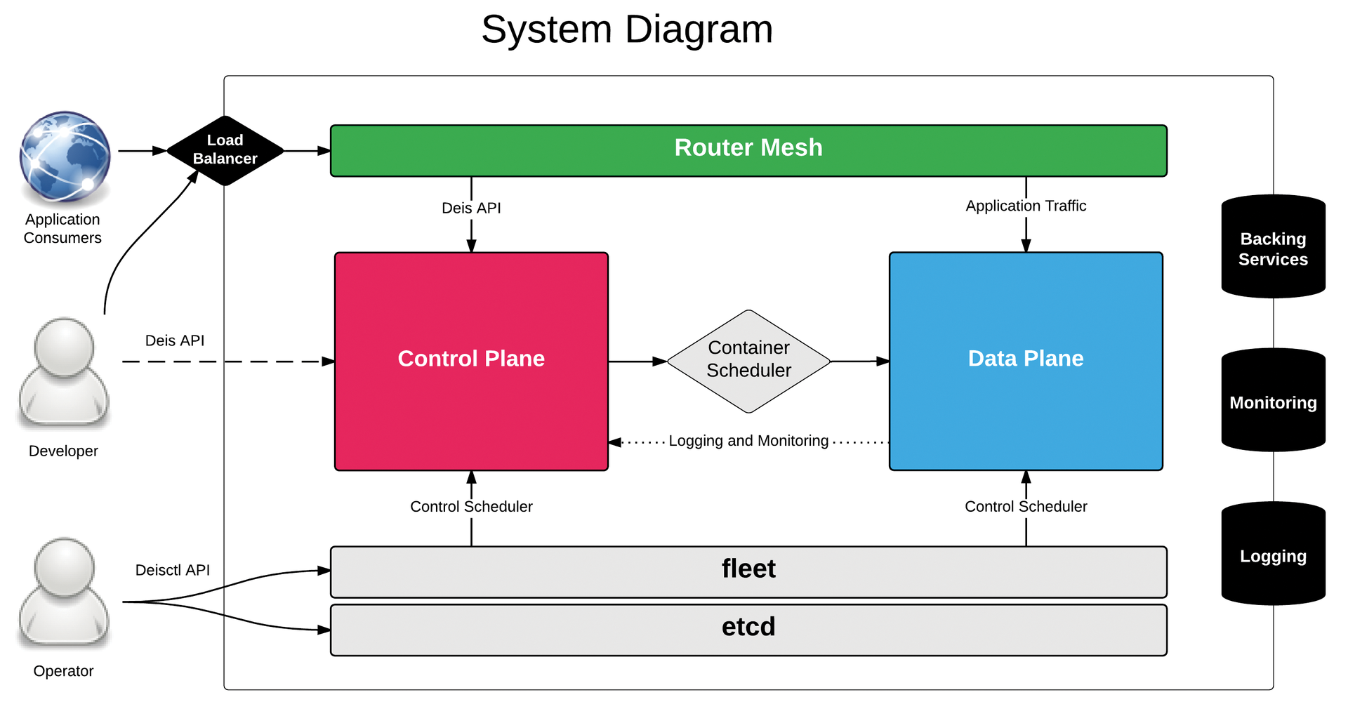 On the basis of an initial image, Deis creates Docker containers on demand with specific capabilities. CoreOS then runs the constructed Docker containers.