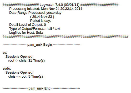 The logwatch report in Figure 2 shows information relating to how the report is configured, when it was run, and how logwatch deals with pluggable authentication modules (PAM) or user logins by default. This section is included at the top of the report because it is key to checking up on the security of your server and makes you aware of which users have managed to elevate their privileges to root with both su and sudo. If root became another user (e.g., for testing), you will also see that information here, if it was user initiated. Anything unexpected in this section will almost certainly warrant further investigation.
