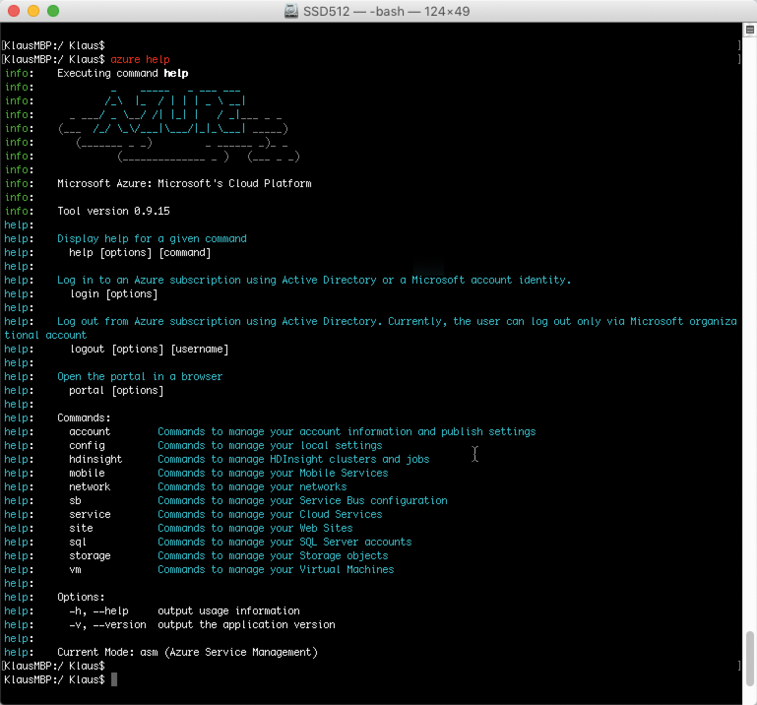 For an overview of commands, type azure help (Figure 1). The list of commands depends on which deployment model you are using. When you display the list of commands, you will see which model is currently is use (Current Mode). If you are using the traditional deployment model (Service Management), you can switch to the Resource Manager with the azure config set mode arm command. If you output the list of commands again, it now looks very different.