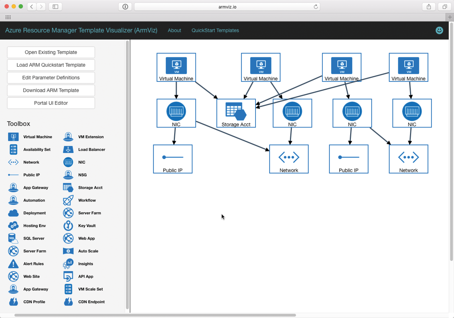 Armviz provides "Quick Start Templates" to help you create a configuration. Browsing and learning is pretty easy given the number of templates. The other buttons should be largely self-explanatory. Click Open existing template to read a JSON file on the administrator's PC and display the file graphically for editing.