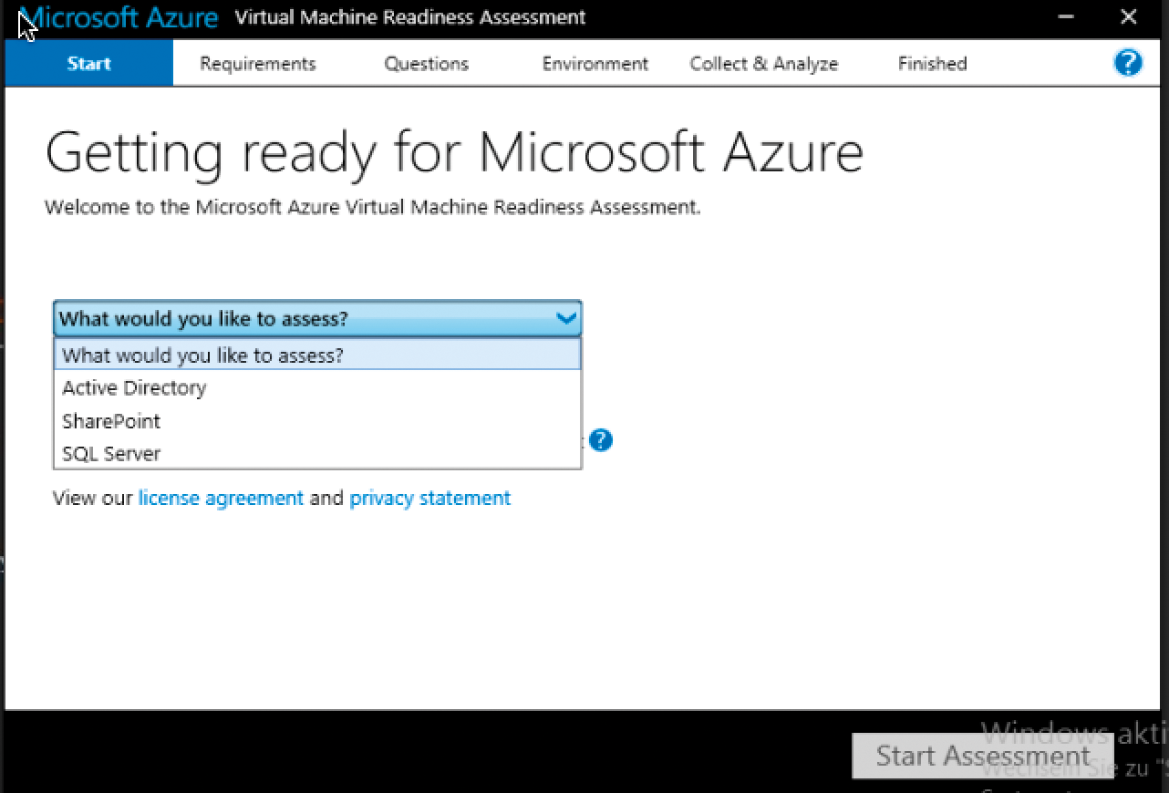 First, you need to check out your AD and decide whether your environment is suitable for the extension to Azure. This is what the "Virtual Machine Readiness Assessment Test" [4] does; you need to answer a couple of questions at the beginning (Figure 1). Armed with the information you provide, the tool checks to see whether the local scenario matches your plans. Among other things, the assessment test examines the network connection and tests the health of the domain controller using dcdiag (Domain Controller Diagnosis). The test is also suitable for a SQL or SharePoint setup. The result of the test is summarized in a Word file, which also provides links to further information.