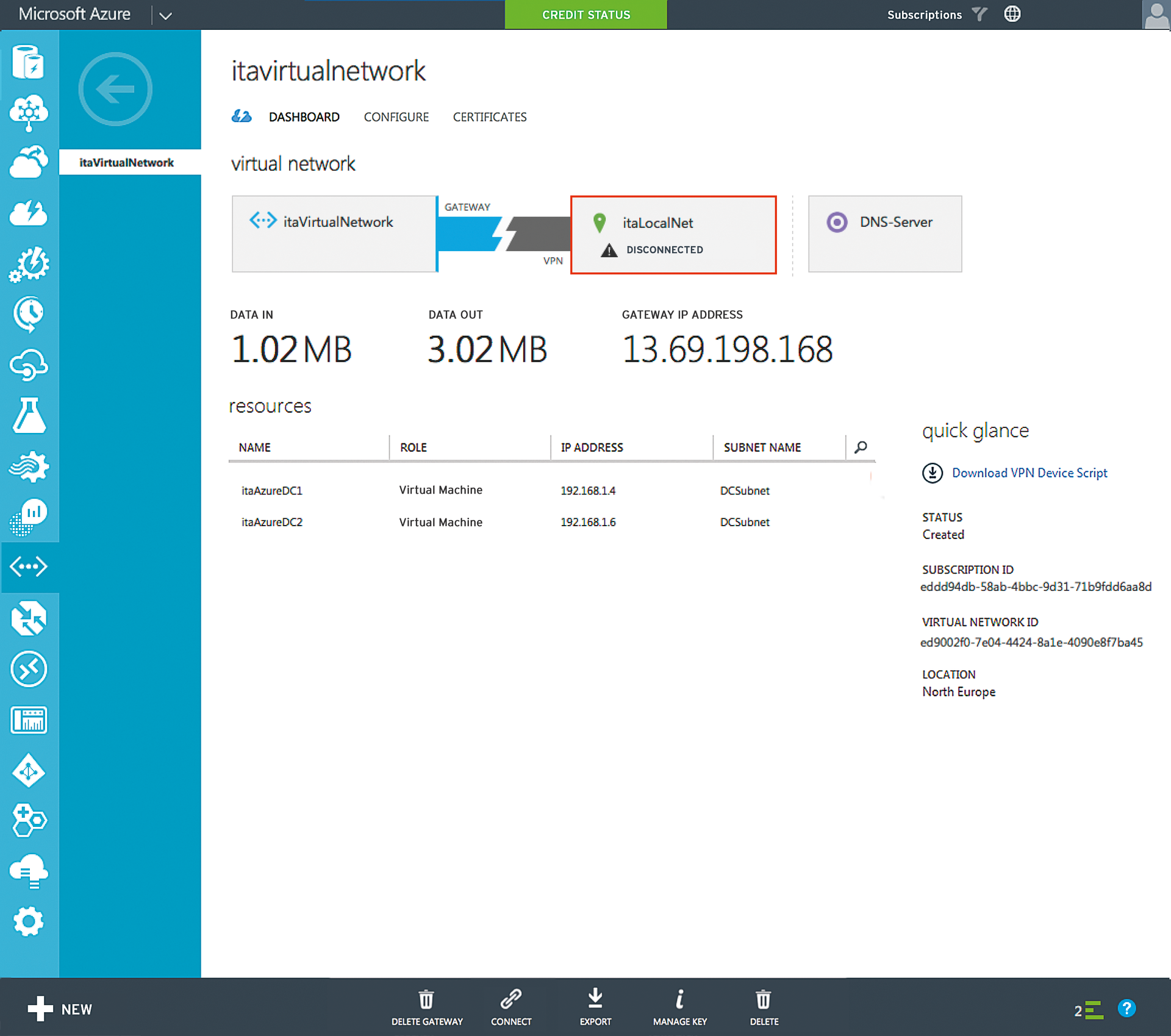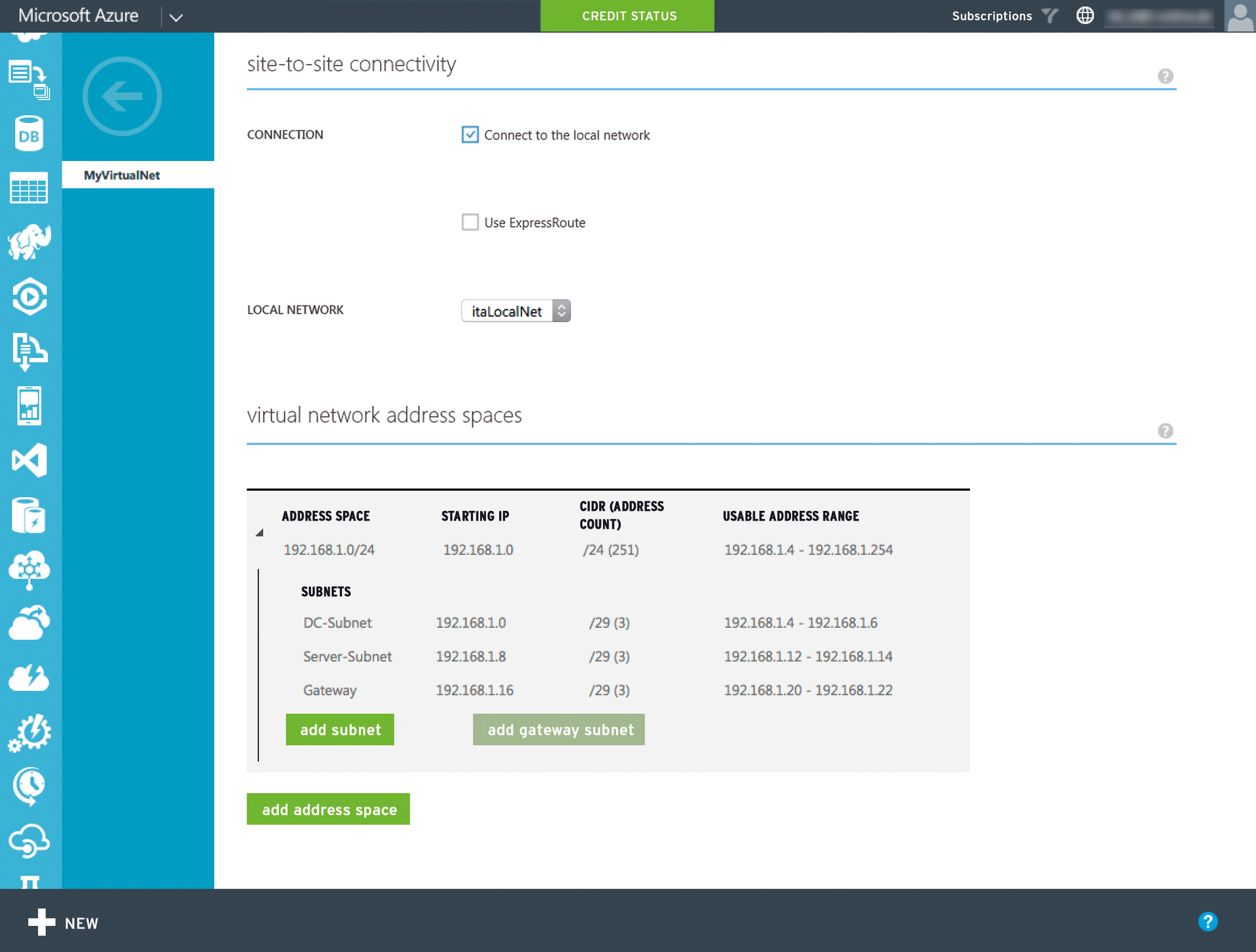 In Azure, all three settings for this procedure are available in the classic portal in the Networks section of the left navigation bar. The configuration of the DNS servers and the local network is self-explanatory. During the configuration of the virtual network, select the previously created local network and the DNS server you added. Figure 2 shows the settings of the subnets used to create the virtual network. What is not shown is the dynamic gateway, which is activated via the same link (located at the bottom of the dashboard for the virtual network) with a single click.