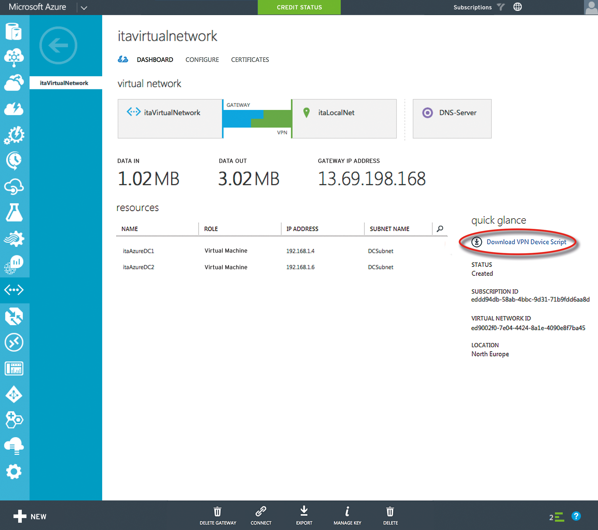 A pre-built script helps to configure the VPN device on the local network; Azure generates this script based on network information you furnished. You will find the script in the dashboard of the newly created virtual network by following the Download VPN Device Script link (Figure 3). Azure supports various network equipment manufacturers, including Juniper and Cisco.